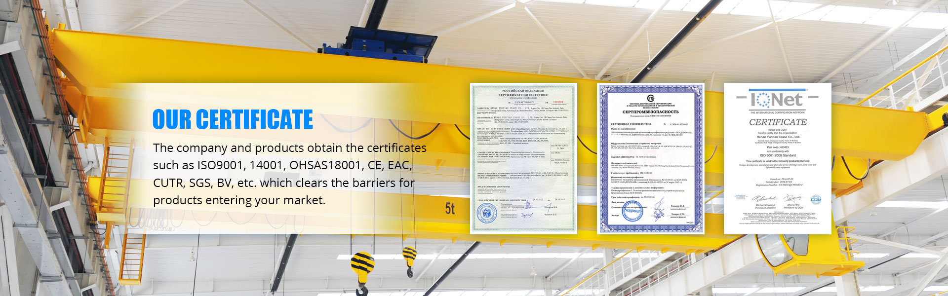 Voimme toimittaa sinulle kaikenlaisia teollisuuden nostureita 0,25 tonnista 900 tonniin, pass GB / T 19001-2000 idt ISO 9001: 2000, GB / T 24001-2004 idt ISO 14001: 2004, GB / T 28001-2001, OHSAS 18001: 1999, CE, GOST, SGS, TUV, BV ja niin edelleen.